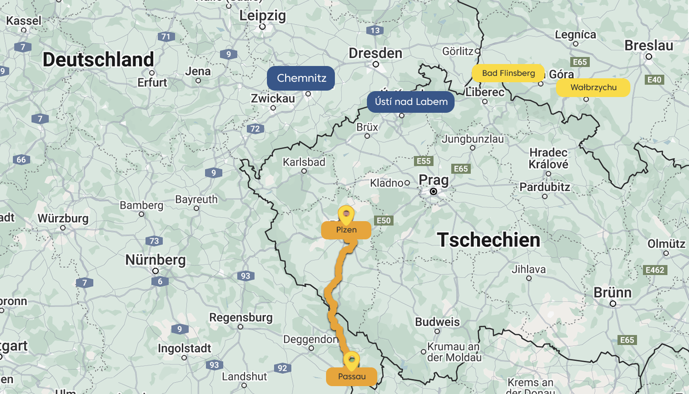 Die Route des Hauptpelotons startet 2025 in Passau, führt durch die tschechischen Städte Plzeň und Ústí nad Labem und endet in Chemnitz, der Kulturhauptstadt Europas 2025.